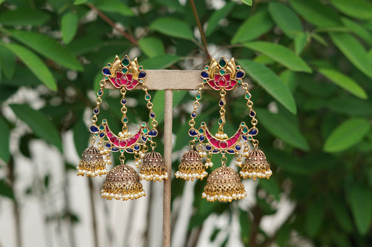 This stunning collection showcases an array of meticulously crafted earrings, ranging from traditional Jhumkas and intricate Chandbalis to contemporary crystal-studded hoops and floral studs.