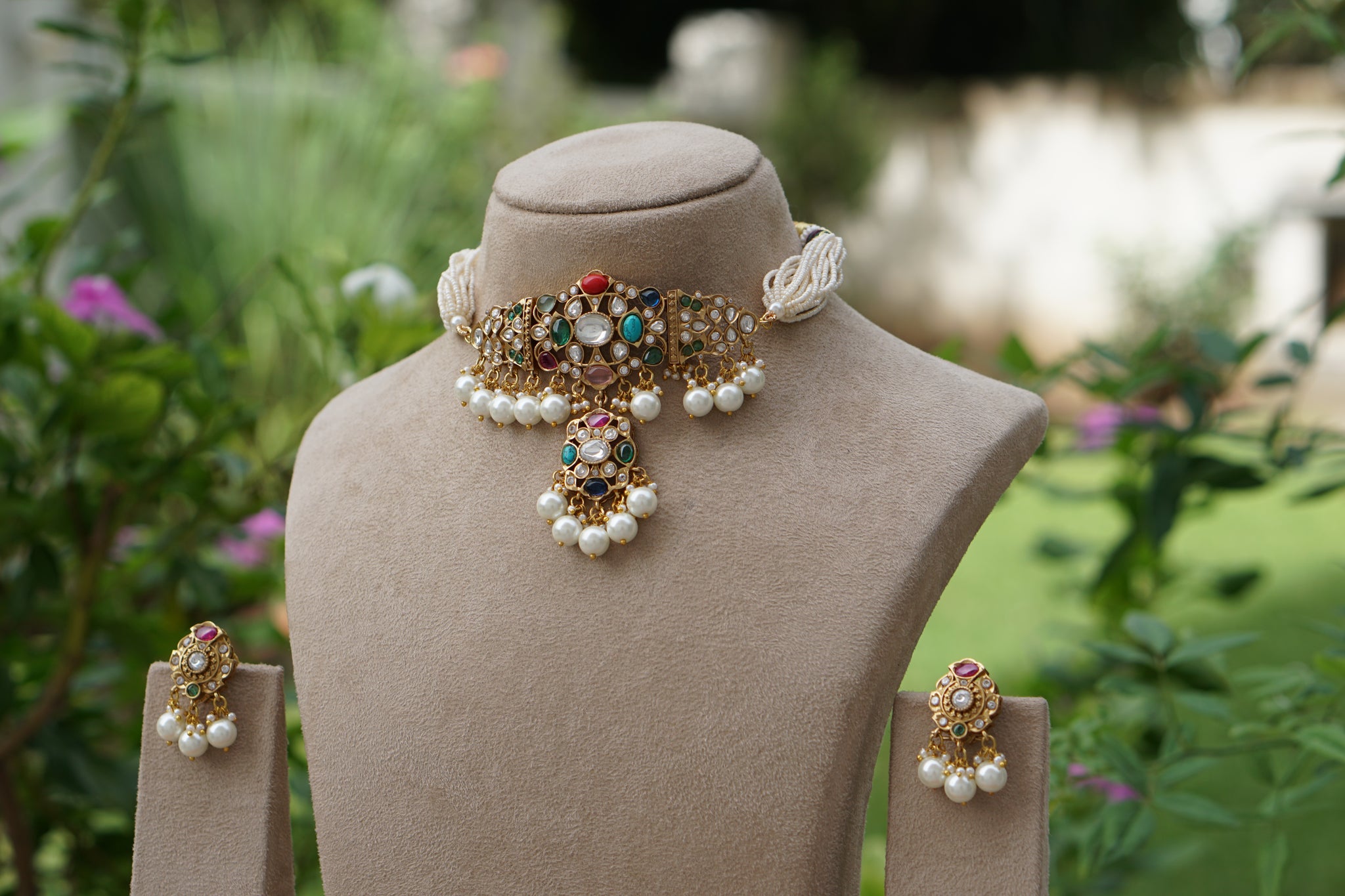 The Navratan Polki choker set (4-8499)(B) was built with people like you in mind. Something to keep you happy. Every. Single. Day.