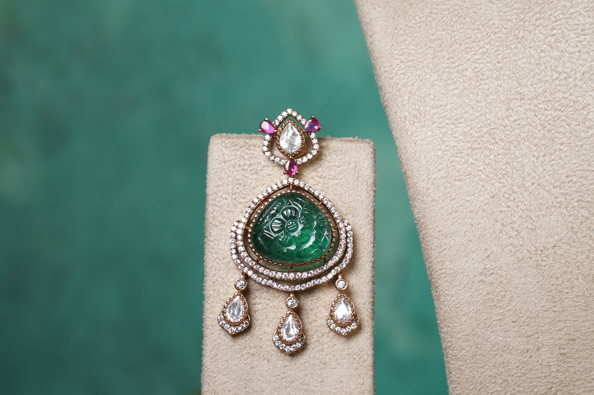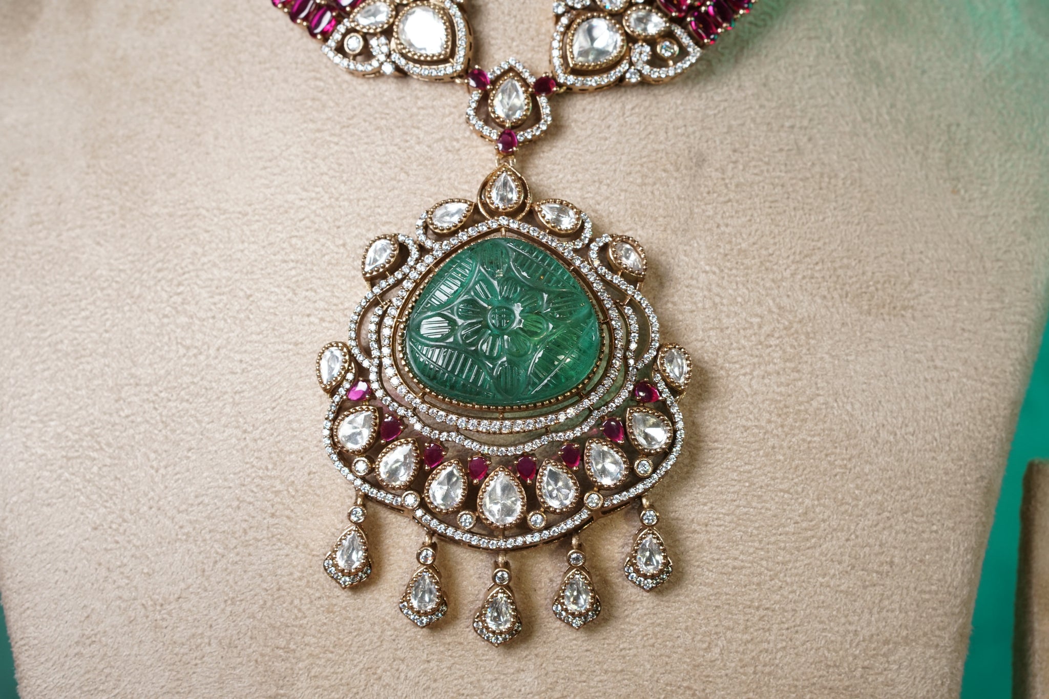 Imagine if you could be satisfied and content with your purchase. That can very much be your reality with the White, Green & Red stone Polki necklace set (4-8491)(B).