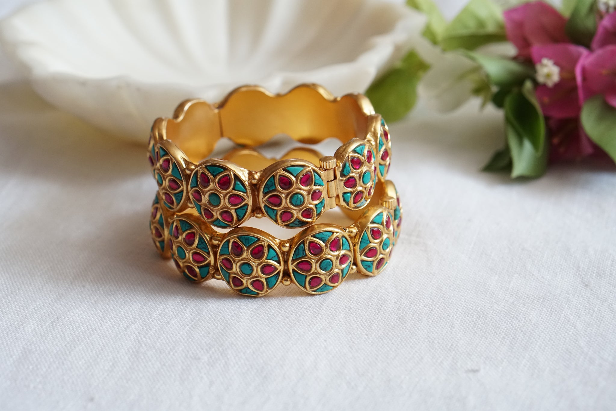SKU : 3-460Featuring gold polished Real Studded Pink & turquoise Stone kundan openable bangle in silver mixed with brass metal.