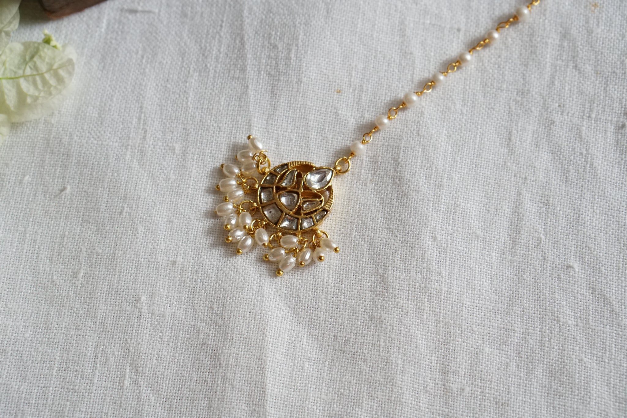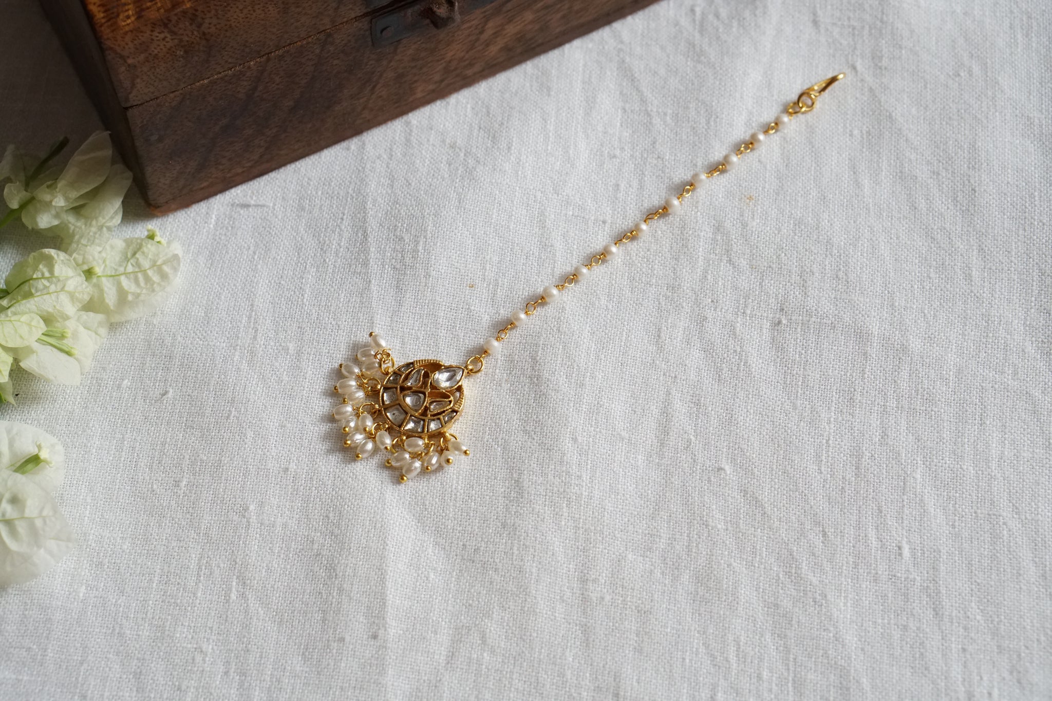 Featuring gold polished kundan Maangtikka in silver mixed with brass metal.