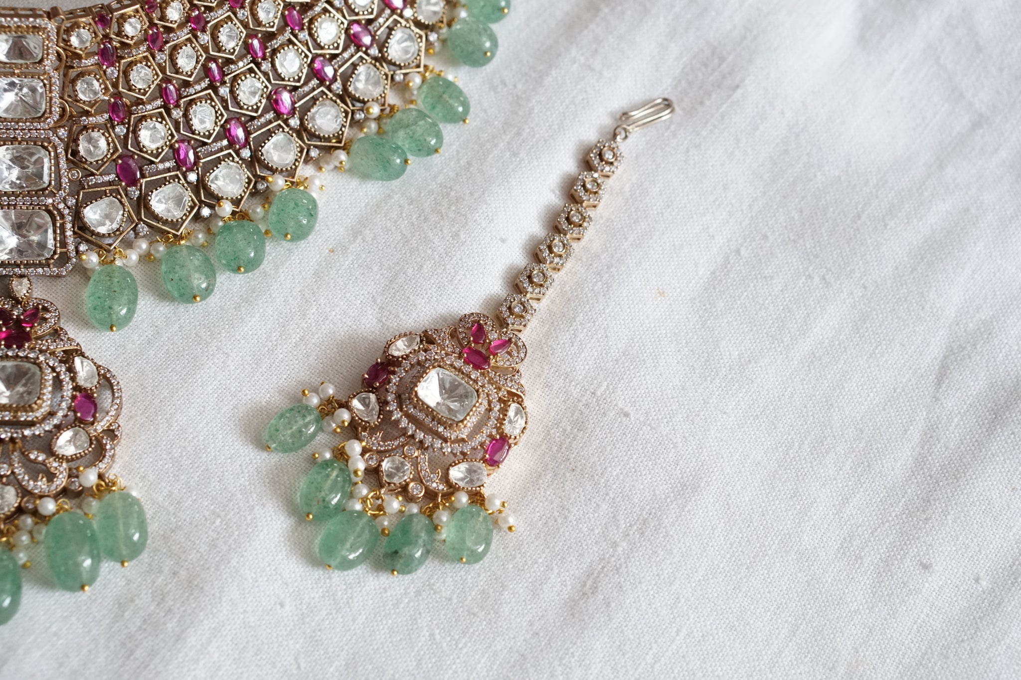 Pink Polki Necklace Set With Maangtika(4-8433)(B)(CLEARANCE SALE PIECE)