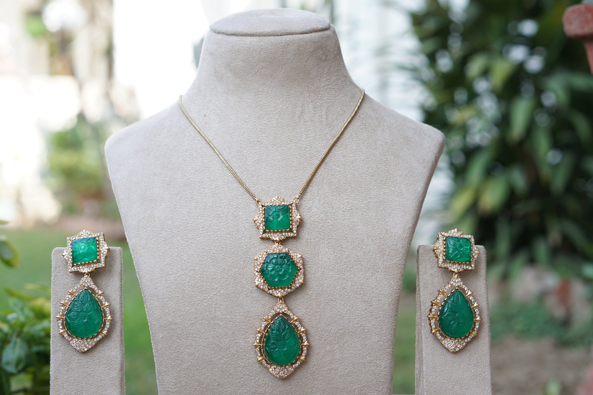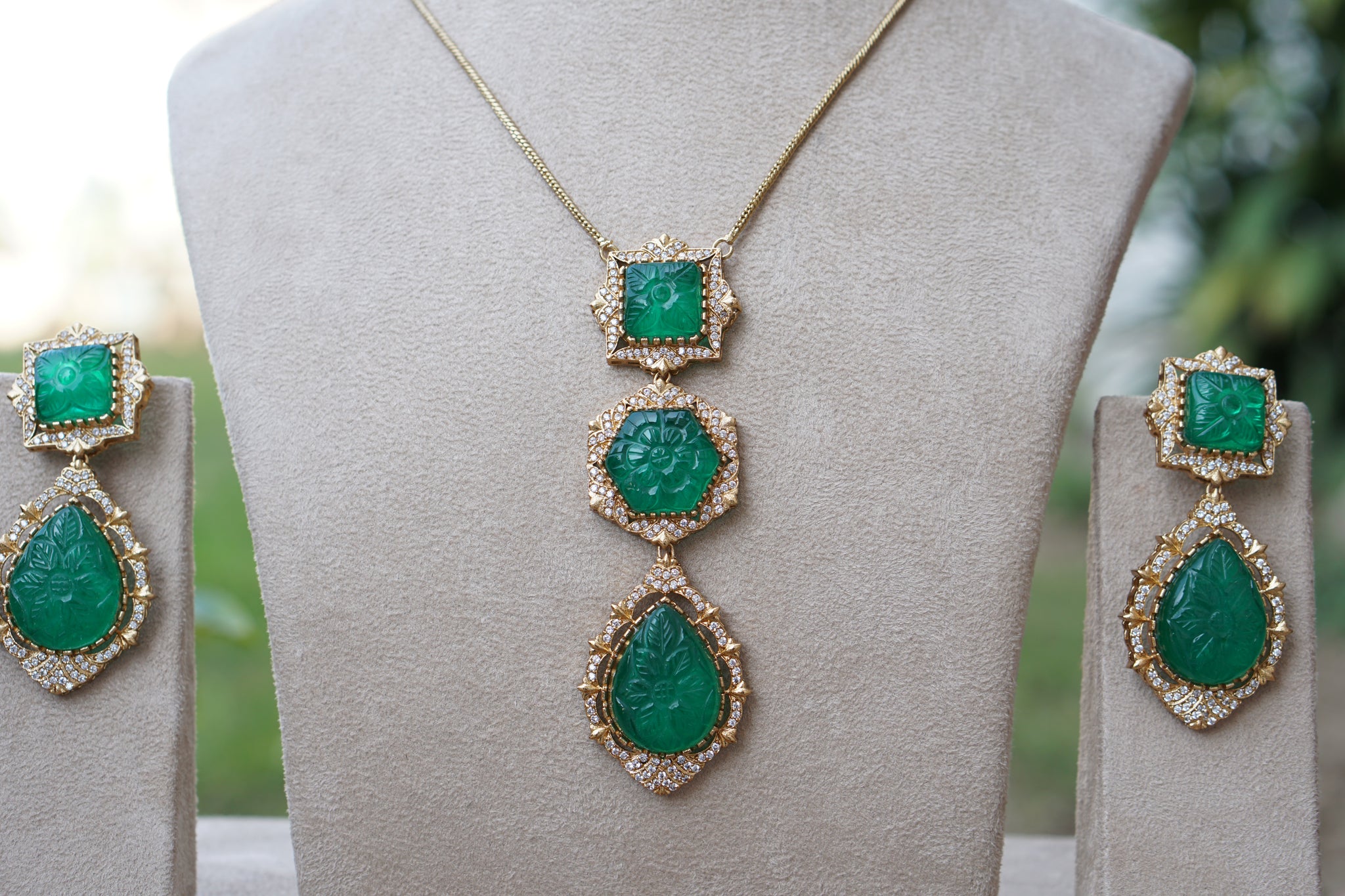 Imagine if you could be satisfied and content with your purchase. That can very much be your reality with the Green Stone Polki Pendant set (4-8781)(B).