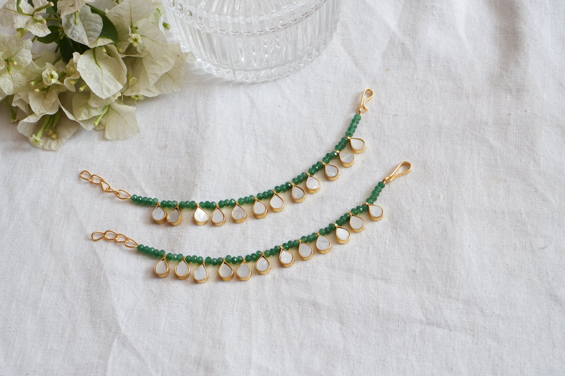 Featuring gold polished Mother of pearl earchain studded in brass metal.