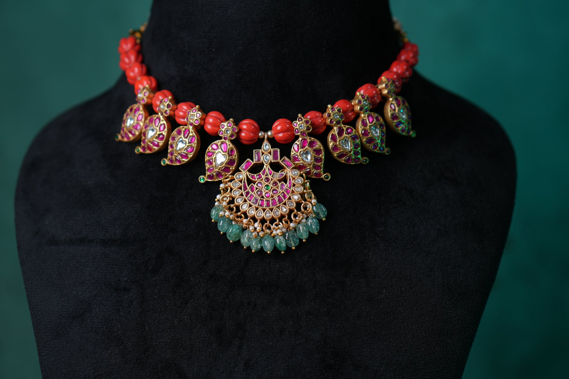 Featuring gold polished Studded Kundan Mango Necklace in silver mixed with brass metal.